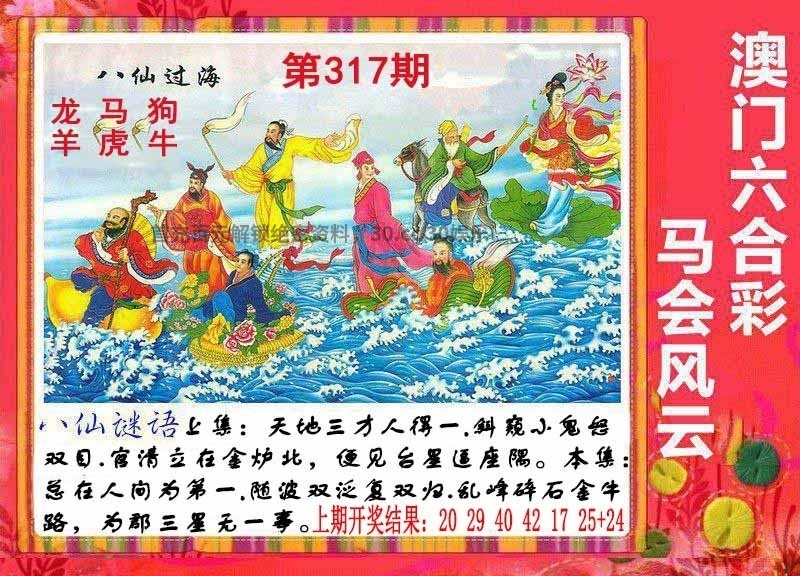 317期八仙谜语:总在人向为第一,随波双泛复双归,乱峰碎石金牛路,为郡三星无一事。 解释:总在人向为第一,随波双泛复双归,乱峰碎石金牛路,为郡三星无一事。解猪狗兔鼠蛇羊猴 特肖:猪狗兔鼠蛇羊猴 主肖:猪狗兔鼠